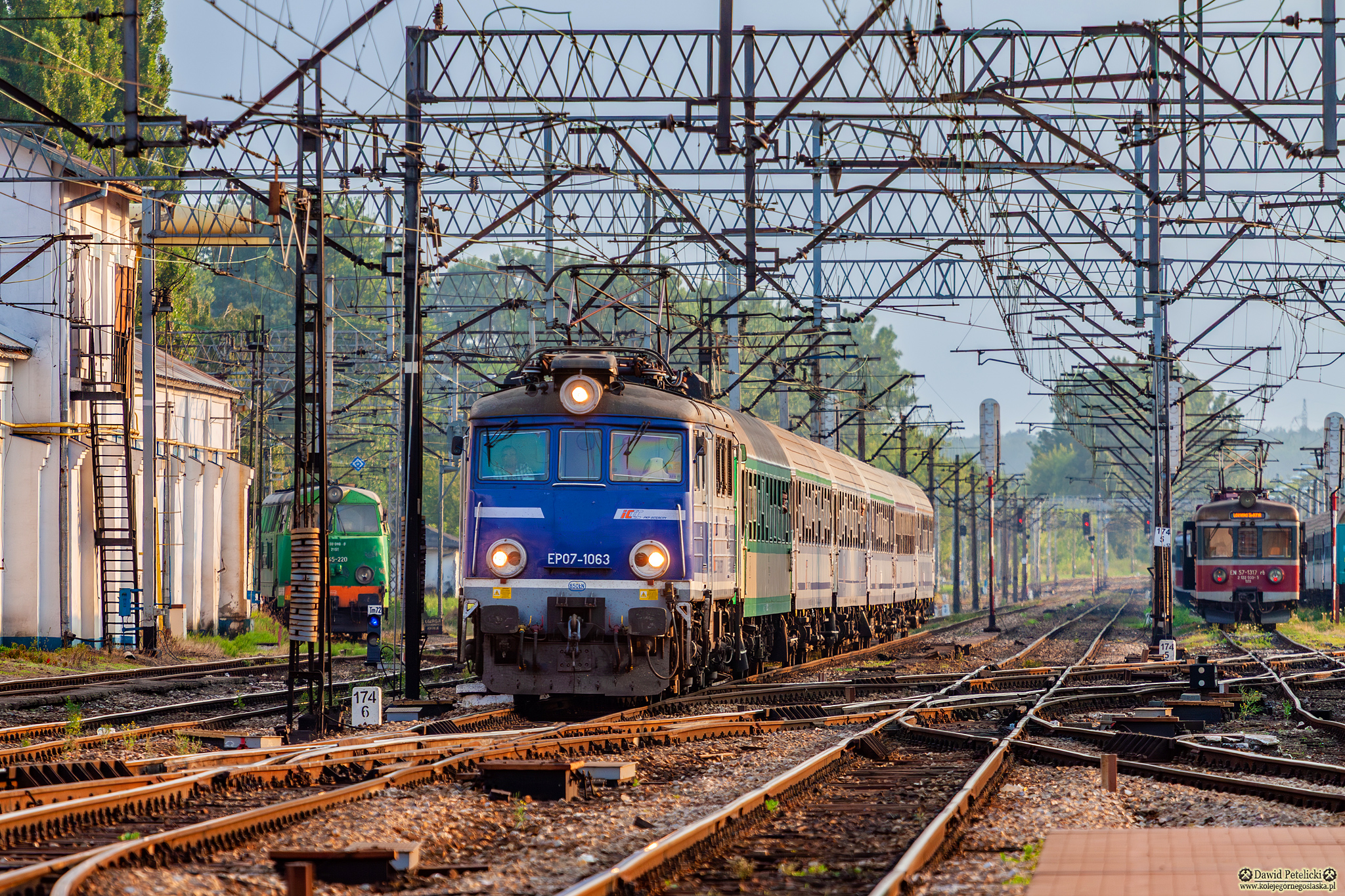 ||Lublin|| EP07-1063 wjeżdża na stację Lublin z pociągiem TLK 53108 WIENIAWSKI relacji Bydgoszcz Główna - Rzeszów Główny. Z lewej strony SU45-220 szykuje się do podjęcia tego pociągu w dalszą drogę do Rzeszowa.