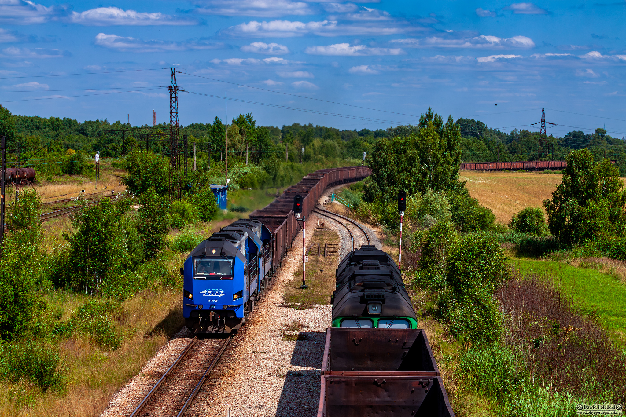 ||Grzybów LHS|| Tandem ST40s-09 z ST40s-06 przejeżdża na biegu ze składem rudy żelaza. Obok na wyjazd czeka tandem ST44-2035 z ST44-2003.