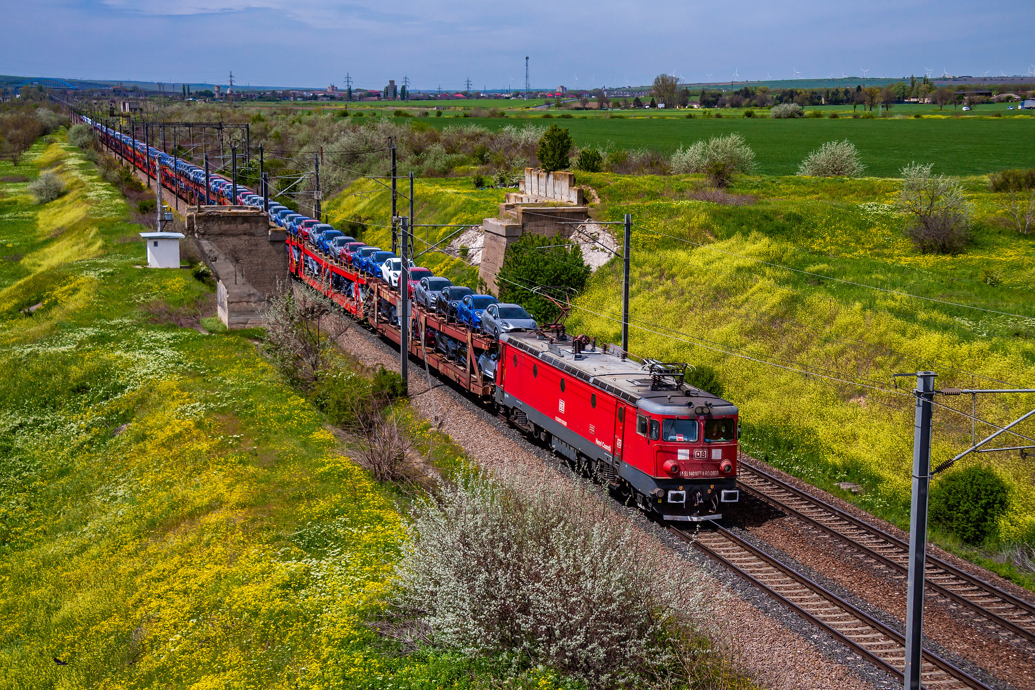 ||Szlak Medgidia - Dorobanțu|| 40-1077-9 (ex 40-0509-6) ze składem autolawet jedzie wzdłuż Kanału Morze Czarne - Dunaj.