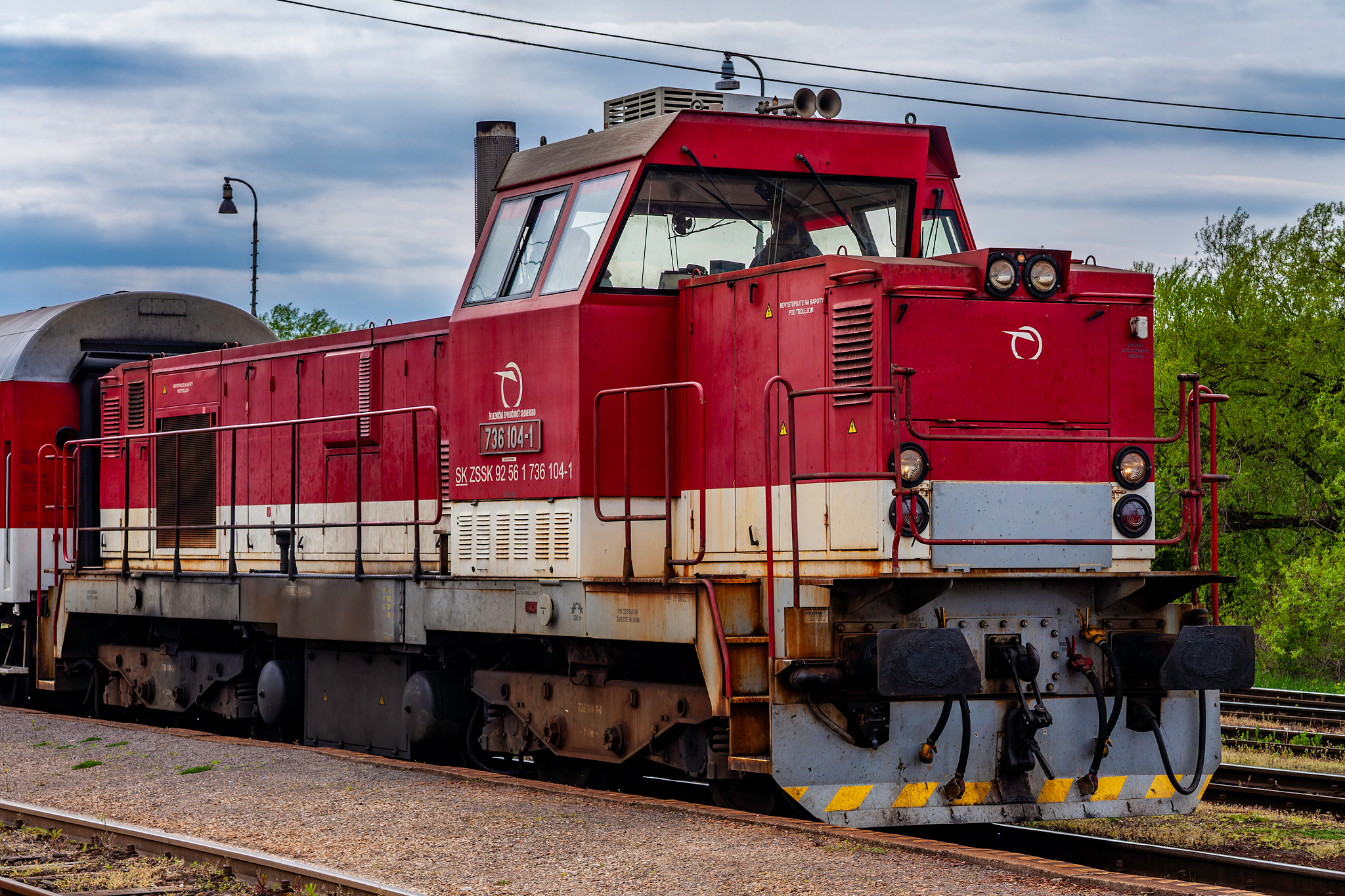 ||Nováky|| 736 104-1 (ex 735 093-7) zatrzymuje się z pociągiem osobowym Os 5521 relacji Topoľčany - Prievidza.