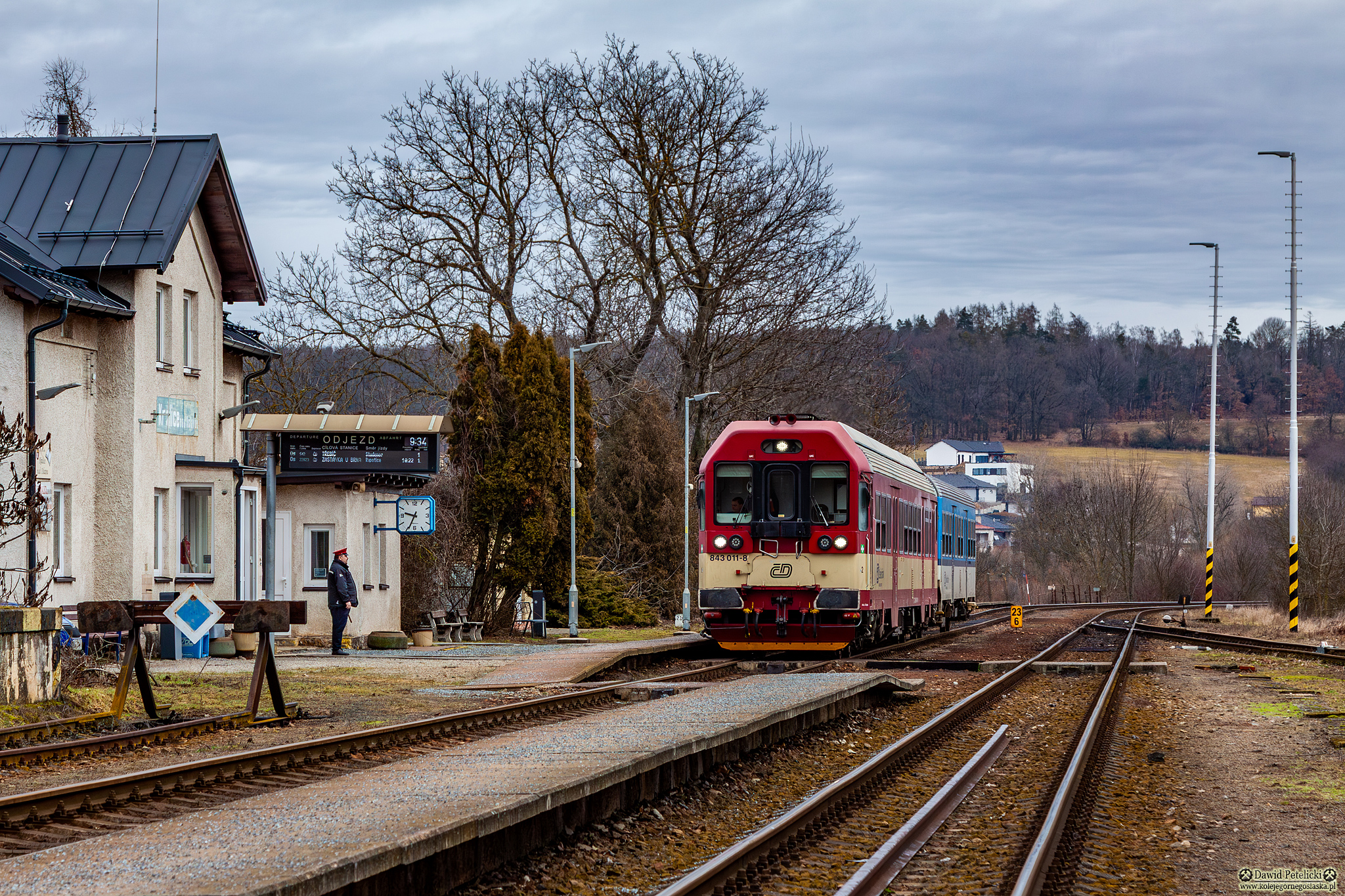 ||Kralice nad Oslavou|| 843 011-8 stoi w peronach jako pociąg osobowy Os 22816 relacji Zastávka u Brna - Třebíč.
