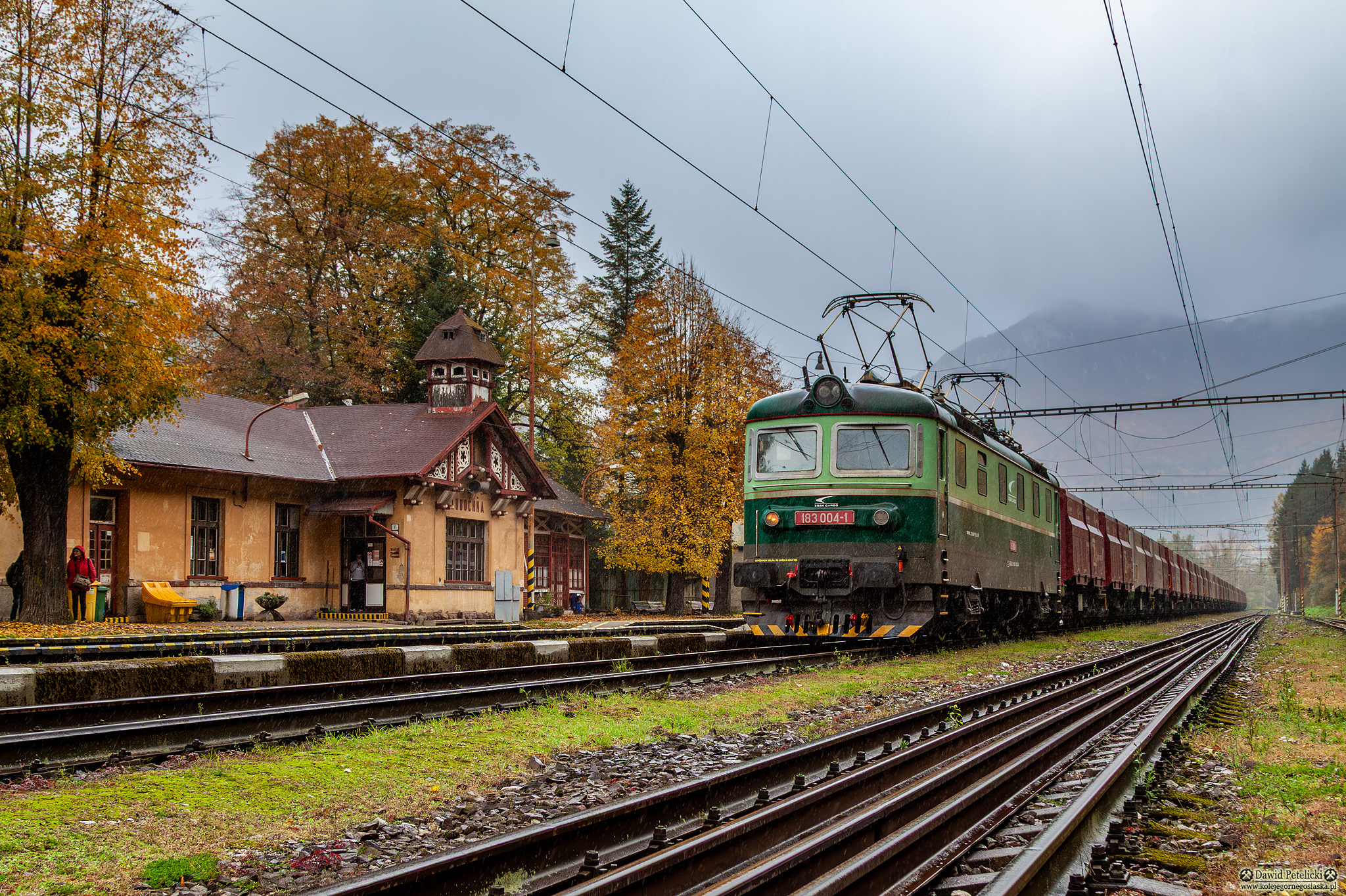 ||Ľubochňa|| 183 004-1 oczekuje odjazdu w kierunku Popradu. Na haku znajduje się skład próżnych kontenerów po rudzie żelaza z trzynieckiej huty do Czarnej nad Cisą.