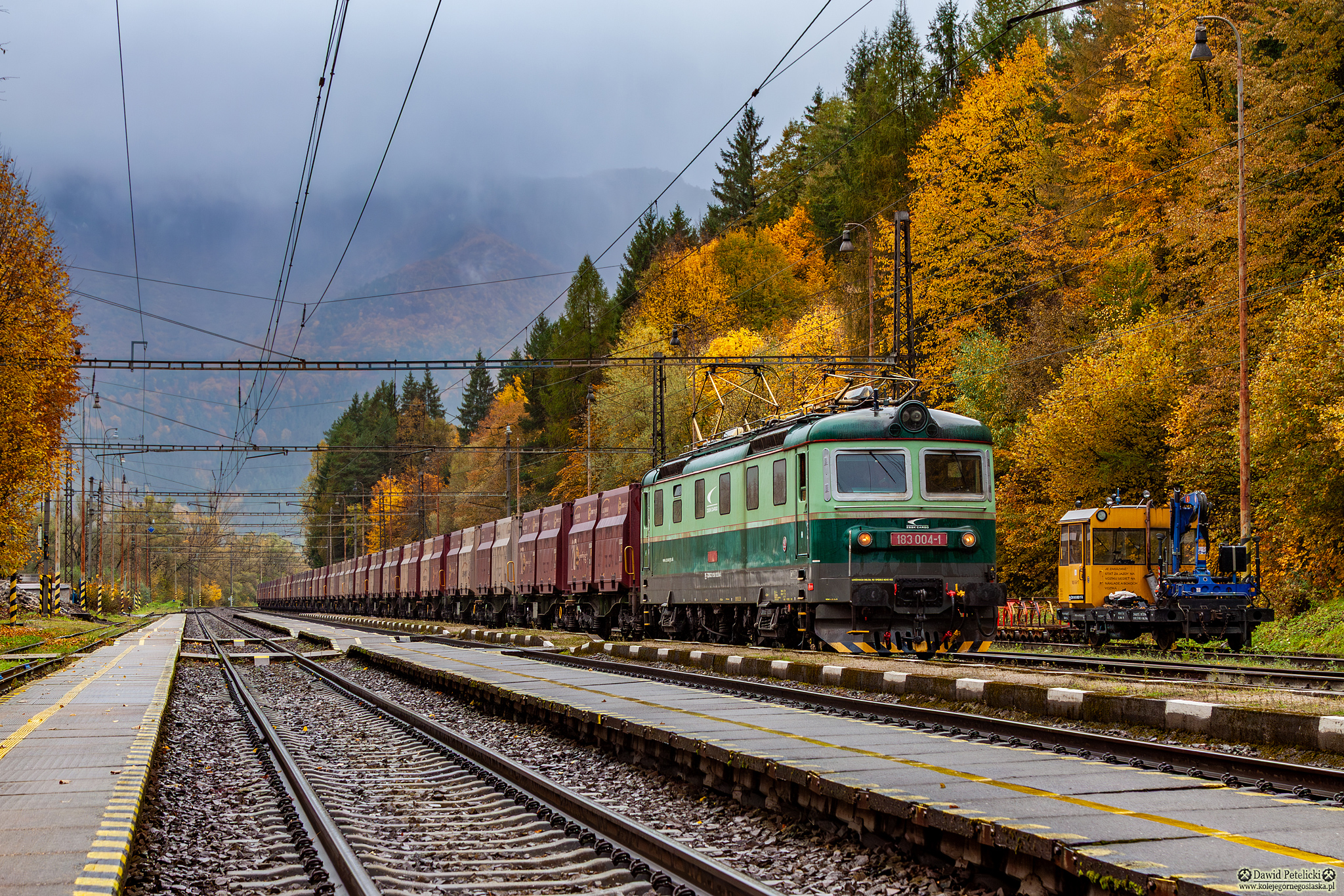||Ľubochňa|| 183 004-1 oczekuje odjazdu w kierunku Popradu. Na haku znajduje się skład próżnych kontenerów po rudzie żelaza z trzynieckiej huty do Czarnej nad Cisą.