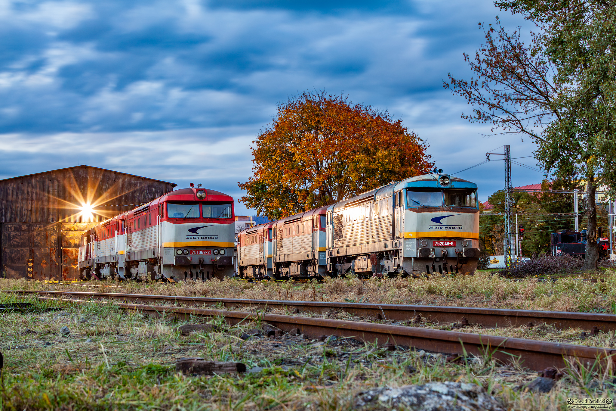 ||Prešov|| Lokomotywy ZSSK Cargo oczekują na pracę przed halą nieczynnej lokomotywowni. Kolejno od lewej 742.352, 751.129, 751.056, 751.074, 751.073, 752.048 oraz pomnik U47.002.