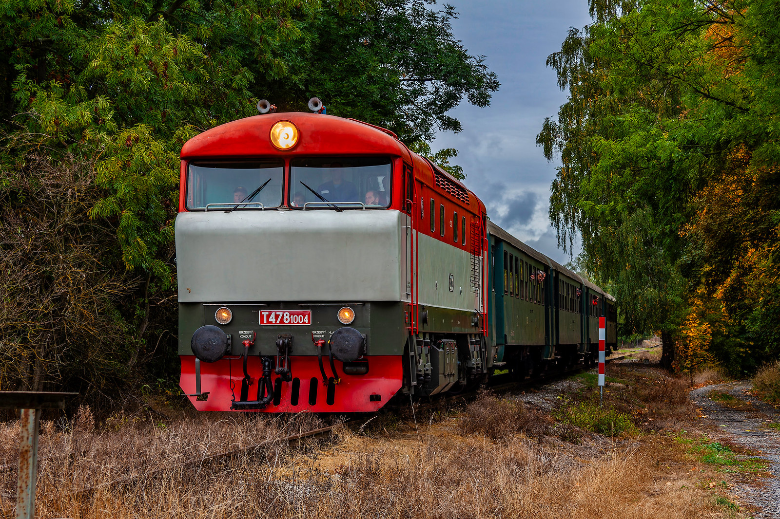||Szlak Krupá - Kolešovice|| T478.1004 z pociągiem specjalnym do stacji Kolešovice zbliża się do stacji Kněževes.