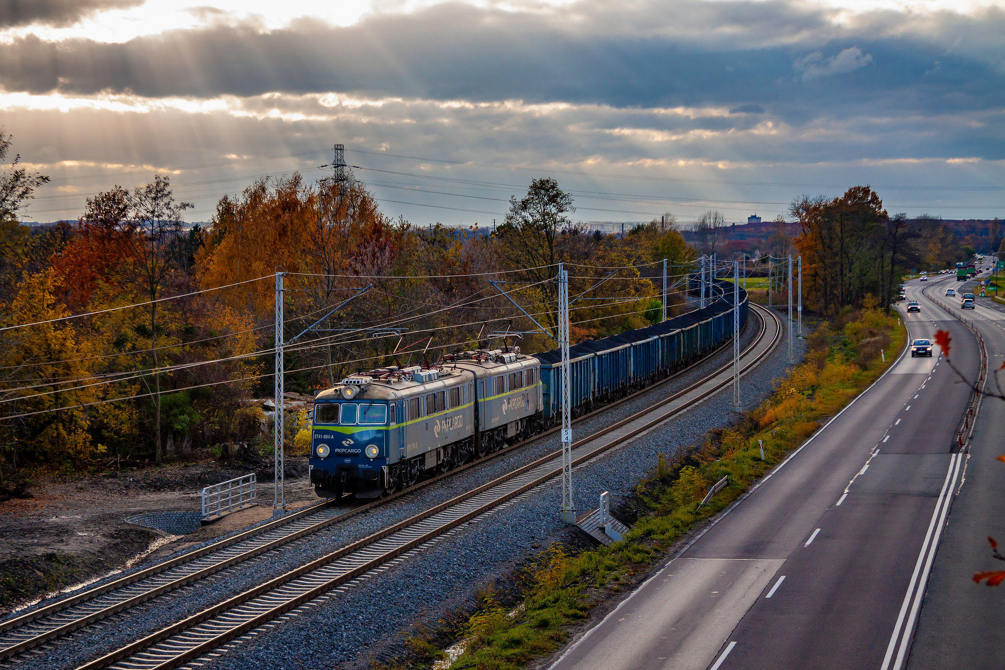 ||Szlak p.odg. Maciejów Północny - Zabrze Biskupice|| ET41-084 z ładowną węglarką zbliża się do dawnej stacji Zabrze Północ zlikwidowanej w okolicy 2000 roku.