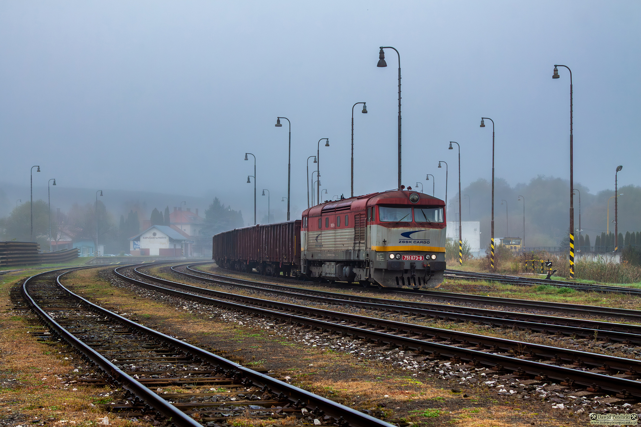ZSSK Cargo czerwono - białe Linia Kolejowa SK 107D poc nr 81211 751.073 Słowacja jesień towarowy węglarki mgła