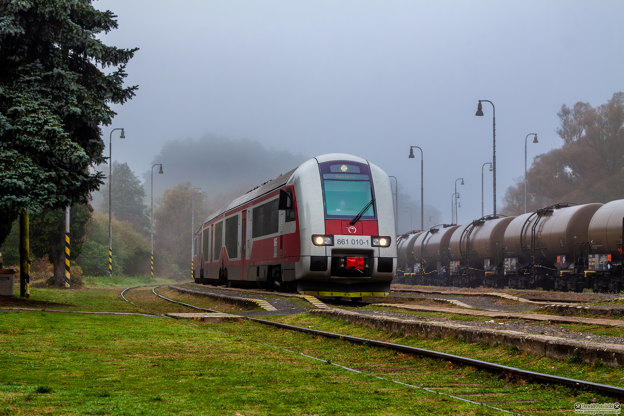 ZSSK czerwono - biało - szare [ZSSK] Linia Kolejowa SK 107D poc nr 9111 861.010 Słowacja jesień osobowy mgła