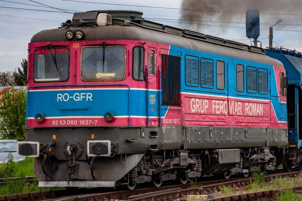||Buhuși|| 60-1637-7 manewruje w stacji Buhuși ze składem ładownych zbożówek.