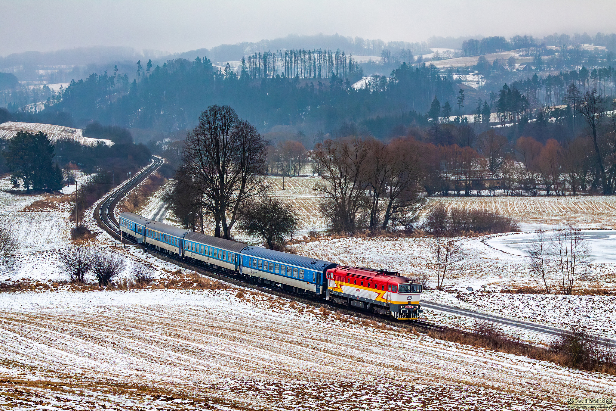 ČD czerwono - białe + żółty pas Linia Kolejowa CZ 311 poc nr 657 754.012 brejlovec nurek Rožmberk rychlik pospieszny zima Czechy TheBest K12V230DR